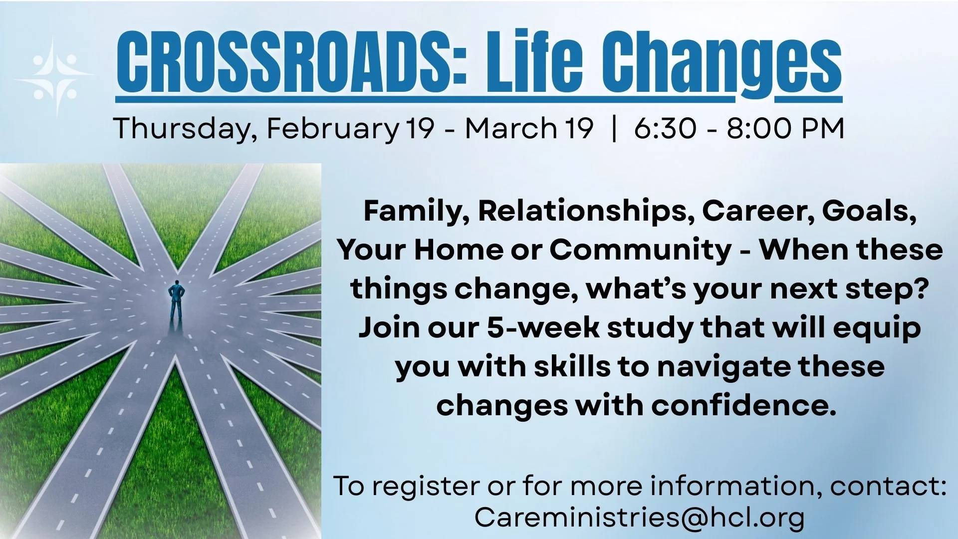 Family, Relationships, Career, Goals, Your Home or Community - When these things change, what’s your next step? In a warm and supportive setting, this 5-week study will help provide and equip you with practical skills to navigate life’s change with confidence. Write your next chapter as you rediscover your purpose, utilizing the many gifts God has given you.